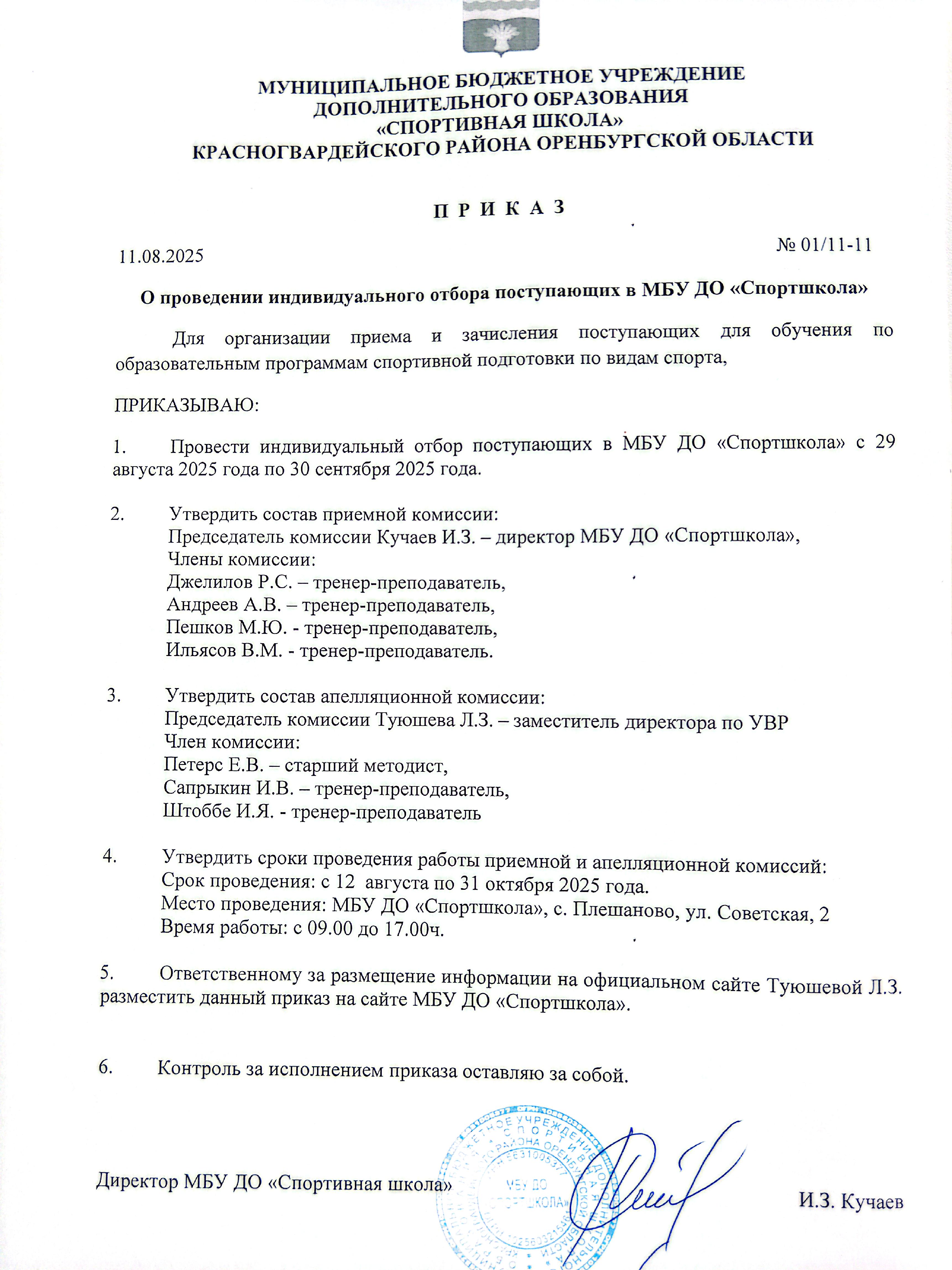 - «Приказ о создании и функционировании приемной и апелляционной комиссий в МБУ ДО «Спортшкола» Красногвардейского района Оренбургской области для зачисления детей на обучение по дополнительным образовательным программам спортивной подготовки в 2025-2026 учебном году» смотреть